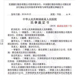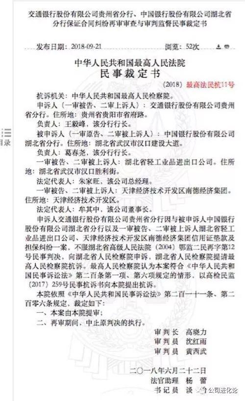 上述最高人民法院民事裁定书显示,申诉人交通银行股份有限公司贵州省分行因与被申诉人中国银行股份有限公司湖北省分行以及一审被告、二审被上诉人湖北省轻工业品进出口公司、天津经济技术开发区南德经济集团信用证垫款及担保纠纷一案,不服湖北省高级人民法院(2004)鄂监二民再字第12号民事判决,向湖北省人民检察院申诉,湖北省人民检察院提请最高人民检察院抗诉。