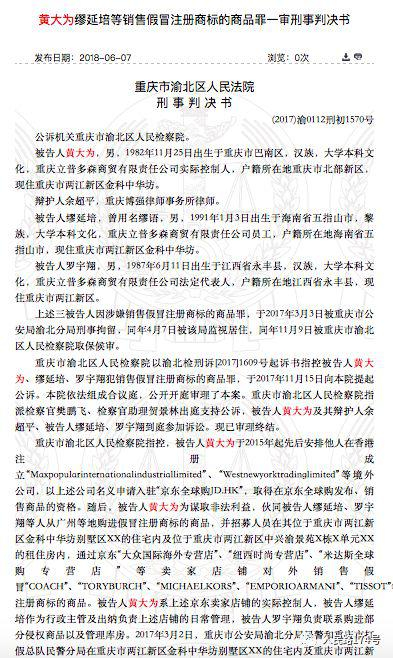 根据中国裁判文书网于今年6月7日公布的重庆市渝北区人民法院刑事判决书,涉案当事人、京东全球购“大众国际海外专营店”负责人黄大为、缪延培等犯销售假冒注册商标的商品罪,分别获刑,并处以最高100万罚金。
