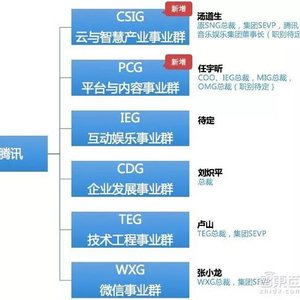 自2012年调整后,腾讯从原来以产品为导向的业务系统升级为事业群制,把业务重新划分为企业发展事业群(CDG)、互动娱乐事业群(IEG)、移动互联网事业群(MIG)、网络媒体事业群(OMG)、社交网络事业群(SNG),整合原有的研发和运营平台,成立新的技术工程事业群(TEG),后续又将微信独立,单独成立了WXG。