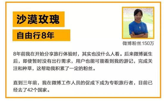 一些旅行达人选择将更多的精力放在了更加开放综合的平台上。知名旅行大V沙漠玫瑰也经历过没人看的窘境,但是她选择了坚持,直到微博的兴起。