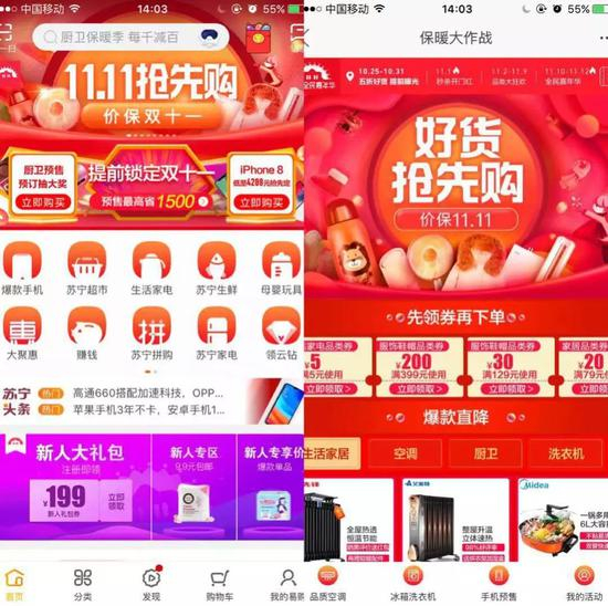 3、苏宁易购:“11.11抢先购”、全场景“购物补贴”