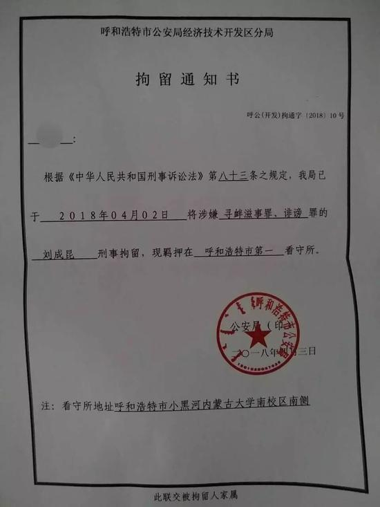 当天,呼和浩特市公安局经济技术开发区公安分局称,接到伊利公司及其董事长潘刚的报案,并在4月9日将涉嫌诽谤罪的刘成昆、邹光祥依法批准逮捕。