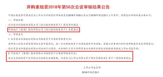 10月25日,证监会网站披露的信息显示,中粮地产(发行股份购买资产)未获得并购重组委的通过。审核意见称,本次交易标的资产定价的公允性缺乏合理依据,不符合《上市公司重大资产重组管理办法》第十一条的相关规定。