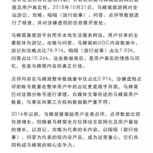 10月20日,《估值175亿的旅游独角兽,是一座僵尸和水军构成的鬼城?》一经发出,便成为“当日最炸裂”。作者梓泉称,根据乎睿数据提供的数据报告,马蜂窝2100万“真实点评”中有1800万条是通过机器人从点评和携程等竞争对手平台上抄袭而来。21日,“小声比比”再次发文《马蜂窝开始毁灭证据了,但这水平真的哈哈哈哈哈哈哈哈》称,在马蜂窝的核心内容“游记”中也存在大量水军,而“问答”板块也没有幸免,并且附上“关键证据”——乎睿数据的75页完整马蜂窝起底报告。
