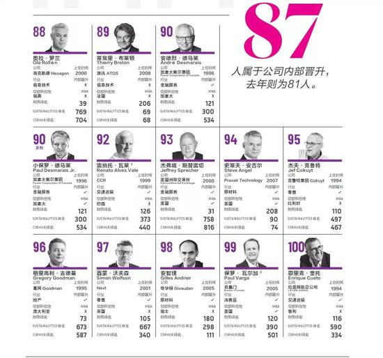 为评估CEO在非财务方面的表现,《哈佛商业评论》分别咨询了Sustainalytics公司和CSRHub公司。Sustainalytics是业内领先的环境、社会与治理研究及分析提供方,主要与金融机构、资产管理方开展合作。CSRHub对来自9家研究机构的数据进行收集、统计和标准化,主要与希望改善ESG表现的企业进行合作。由此我们数据中的所有企业有两种ESG排名,其一是Sustainalytics排名,其二是CSRHub排名。财务排名权重占80%,两种ESG排名各占10%,并且剔除2018年6月30日前卸任的CEO,据此综合得出今年CEO排名的最终榜单。