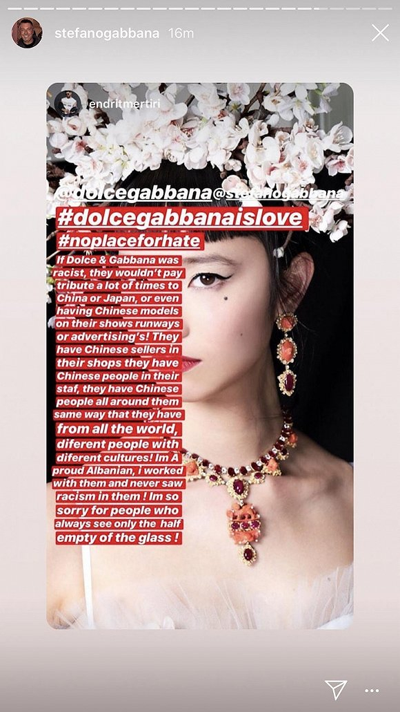 “如果Dolce & Gabbana真的是种族歧视,我们不会那么多次对中国和日本致敬,或者请中国模特和拍摄与中国有关的广告。” Gabbana写道。