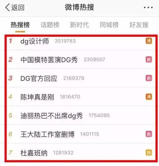 21日下午下午14:50左右,“dg设计师”、“迪丽热巴不出席dg秀”、“杜嘉班纳”、“陈坤不出席dg秀”等等话题接连登上热搜,几乎占尽排名前十。