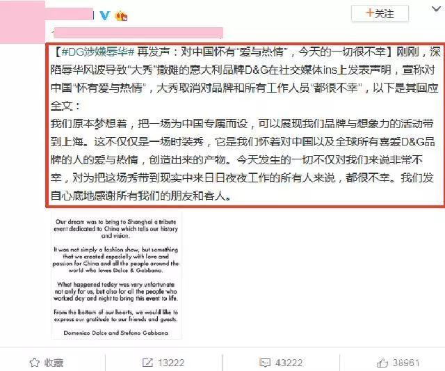21日深夜,D&G在社交媒体ins上发表声明,宣称对中国“怀有爱与热情”,大秀取消对品牌和所有工作人员来说“都很不幸”。