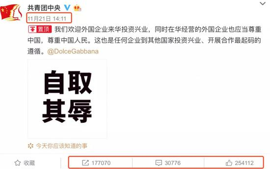 最后用共青团中央正面喊话D&G并置顶的微博作为结尾: