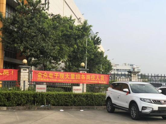 记者发现,工业园传达室外拉出两个显眼的红色横幅,显示着“金铭客户服务部招聘外呼及兼职线上客服人员”、“金众电子现大量招各岗位人员”。记者拨打了招聘电话,未有人接听。“前几个月,金众确实有大量裁员,员工只剩下80人左右了。最近好像人又变多了,大概有一两百人的样子。”一名途经的金立员工告诉记者。