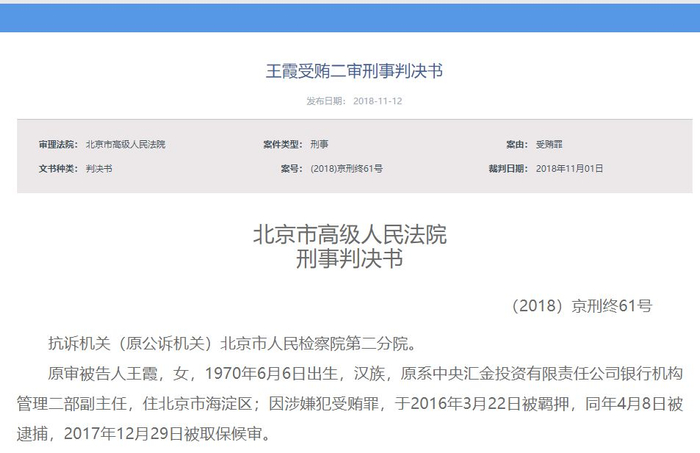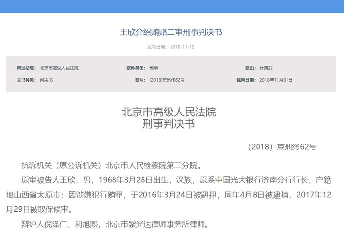 11月,北京法院审判信息网发布了《王欣介绍贿赂二审刑事判决书》和《王霞受贿二审刑事判决书》、《王欣行贿一审刑事判决书》。