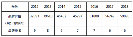 2018年,在品牌咨询公司Interbrand发布的“2018全球最佳品牌”榜单中,三星电子在全球品牌排行榜中名列第六位,连续第七年进入世界品牌前十强。