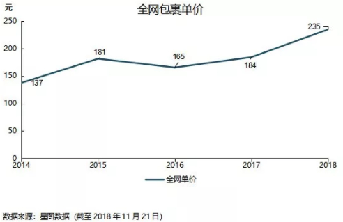 2018双十一全网共产生包裹13.4亿个,对比去年的13.8亿个包裹数下降了2.9%。单个包裹价格从184元上升27%至235元。