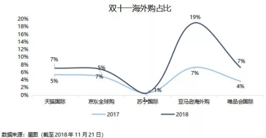今年共有75个国家和地区超过19000个海外品牌的参与了双十一狂欢。随着参与国家地区的增加和品牌的扩大,今年在各主要电商平台双十一销售额中,海外购占比出现了明显上升。其中亚马逊由于自身国际平台优势,海外购占总销售额的比重由2017年的7%同比增长1.6倍至2018年的19%。