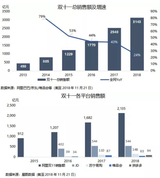 双十一增速显著回落:2018双十一全网销售额3142亿元,同比增长24%,较去年增速43%显著下滑。