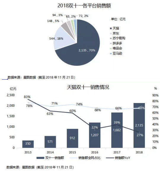 几家欢喜几家愁:2018年双十一阿里全网销量占比重新上升,同比增速为27%,京东同比增速0%,唯品会出现负增长,拼多多首战告捷。