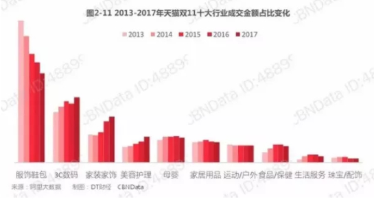 根据CBNData数据显示,2013-2017五年的天猫双十一中,服饰鞋包这一传统消费类别的占比逐年下降,更多的成交金额分配到了3C数码、家装家饰、美容护理等更多细分品类上。这表明,随着移动互联网的发展,消费者网上购物的行为更加普遍,更加生活化,“Everying都在网上买”成为了新网购的趋势。