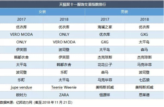 女装品牌前三分别是优衣库、ONLY和VERO MODA,ZARA首次进入女装行业TOP10,而老牌女装欧时力被挤出前十。ONLY、ZARA、VERO MODA等国际时尚品牌在天猫双十一中取得不俗的战绩,反映女性剁手党的选择和品味更加多元化。