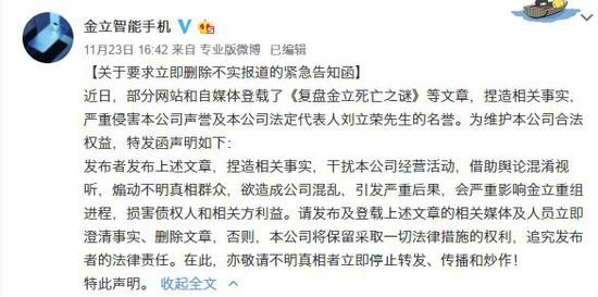 上周五,金立发布了辟谣微博↓↓刘立荣的老同学、金立财务总监何大兵也表示,金立的负债并没有达到外界传的超过200亿元,至于“刘立荣在赌博上输了超过100亿元、挪用公款数额或在60亿元”的消息,并不属实。刘立荣此番现身,可谓真·打脸!