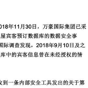 2018年9月8日,万豪国际收到一条内部安全工具发出的关于第三方试图访问喜达屋宾客预订数据库的警报。万豪国际迅速聘请了权威安全专家帮助确定已发生的情况。万豪国际在调查过程中了解到,自2014年起,即存在第三方对喜达屋网络未经授权的访问。万豪国际最近发现未经授权的第三方已复制并加密了某些信息,并采取措施试图将该等信息移出。2018年11月19日,万豪国际成功解密该等信息,并确定信息的内容来自喜达屋宾客预订数据库。