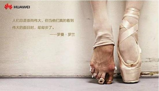 2015年的华为广告,是任正非发现的一幅获金奖的照片。作者是一个美国人,一辈子就拍芭蕾舞,坚持拍了三十年,这就是一种坚守。他在纽约芭蕾舞团拍了4年,不知拍了多少张,就这张获了金奖。任总看完这个照片,立马冒出一句来,这不就是华为吗?这就是华为的身份证明,是华为的真实写照。一开始的广告词是:我们的人生痛苦并快乐着。后来用的罗曼·罗兰小说《约翰·克里斯多夫》里有句话“人们总是崇尚伟大,但当他们真的看到伟大的面目时,却却步了。”