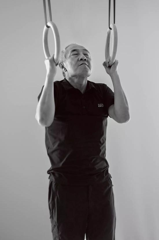 几乎每一件小事都可被他上升到‘斗’的层面。今年64岁的他看起来非常强悍,极度乐于展现自己的体能。他几乎会在接待每一次采访拍摄时都在工位的吊环上做引体向上,并享受来访者的惊讶和赞叹。做完18个引体向上后,他解释,‘我现在是很简单,每年增长1岁,增加1个。比如2018做18个。明年是2019年就做19个。’
