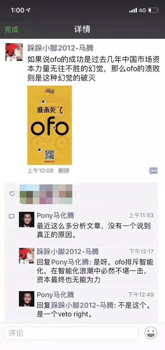 至于马化腾所述的否决权,究竟是指如何影响ofo发展的,截图中没有说明,腾讯方面也没有给出更多解释。