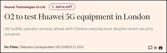 《金融时报》标题:O2公司将在伦敦测试华为5G设备