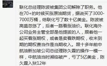 另一个流传颇广的微信对话截图则称,“联化总经理陈波被集团公司解除了职务。他在70+的时候买涨原油期货,据说买了3000至7000万桶,给联化亏了数十亿美元。”