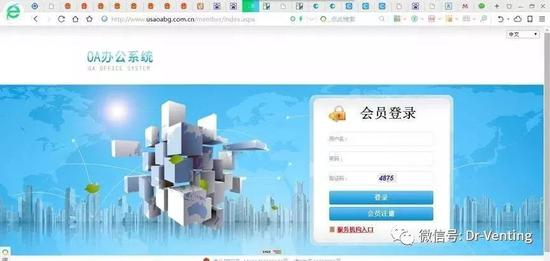 这是一个在线OA系统,上有会员登录窗口,分列用户名、密码、验证码等栏目。其下,另有一个红色字样的“服务机构”入口,点开机构类型的下拉菜单,分列店铺、会所、分公司三个备选项。