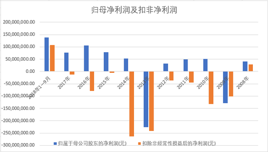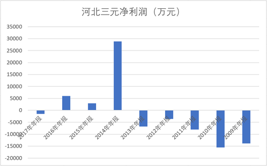 2008年至2017年10年间,三元股份营业收入增加了333%,归母净利润仅增加86.52%,扣非净利润连亏9年,累计亏损8.84亿元。