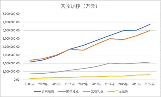 然而,三元股份高开低走,自2008年后,主营业务连亏9年,累计亏损额超8亿元。截至2017年,乳业龙头伊利年营收超680亿元,三元营收刚过60亿元。