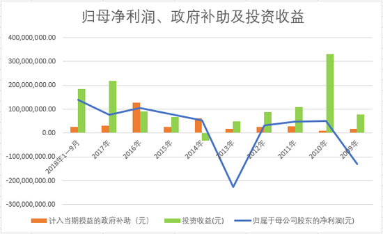 从上图可以看出,2009年、2013年,上市公司投资收益及政府补助均处于低位,归母净利润均出现巨亏。