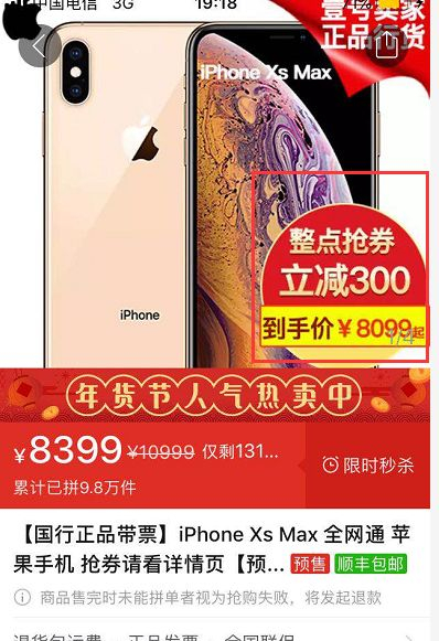 拼多多上iPhone XS Max到手价最低8099元,与苹果官网报价9599元相差1500元。