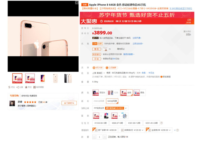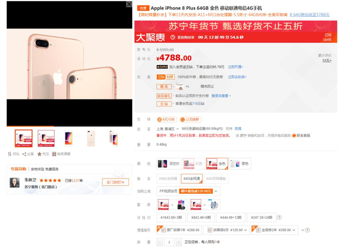 苏宁易购显示,iPhone 8P 64G到手价为4788元,较苹果官网5999元的售价便宜1211元;iPhone 8 64G到手价为3899元,较苹果官网的5099元便宜1200元;iPhone X 64GB到手价则为5788元。