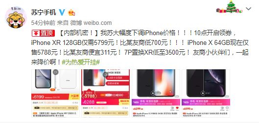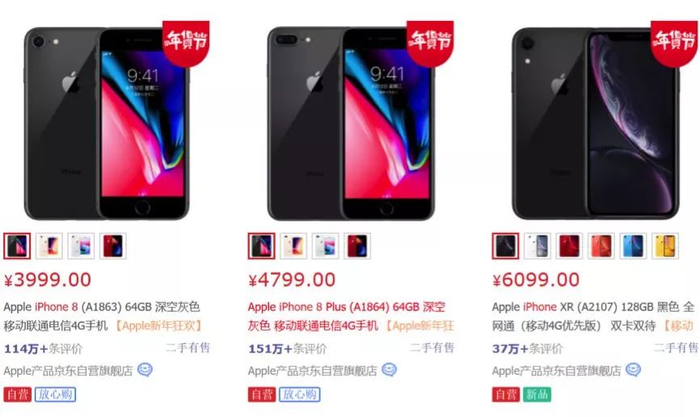 1月11日零点开始,苹果在天猫平台也大幅下调iPhone售价。在天猫苏宁易购旗舰店 iPhone XR、iPhone 8/8P的价格分别下调至5549元、3899元和4788元,最高比苹果官网售价低1200元。同时,天猫手机方面表示,年货节期间针对iPhone XS、iPhone XS MAX等热门机型进行补贴,新品iPhone最高直降1500元。