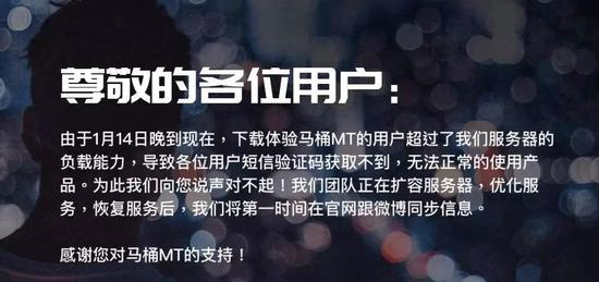 由于 1 月 14 日晚到现在,下载体验马桶MT的用户超过了我们服务器的负载能力,导致各位用户短信验证码获取不到,无法正常的使用产品。