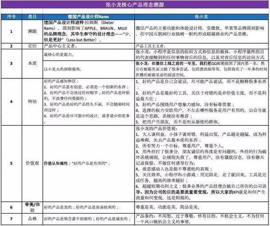下表我们通过与他提到的德国产品设计师迪特·拉姆斯(Dieter Rams)的对比,进一步分析他的微信哲学,如表: