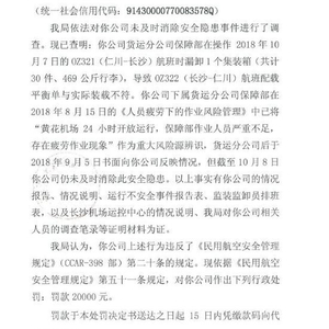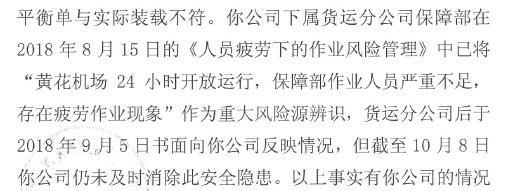 此外,公告中还指出,此前在2018年8月15日的《人员疲劳下的作业风险管理》中,该公司下属货运分公司保障部已将“黄花机场24小时开放运行,保障部作业人员严重不足,存在疲劳作业现象”作为重大风险源辨识。但截至10月8日,该公司仍未及时消除此安全隐患。