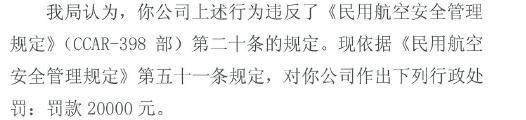 民航中南局认为,该公司上述行为违反了《民用航空安全管理规定》第二十条的规定,并依据相关规定,对该公司作出下列行政处罚:罚款20000元。