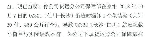 根据公告,湖南空港实业股份有限公司货运分公司保障部在操作2018年10月7日的OZ321(仁川-长沙)航班时漏卸1个集装箱(共计30件、469公斤行李),导致返航的OZ322航班配载平衡单与实际装载不符。