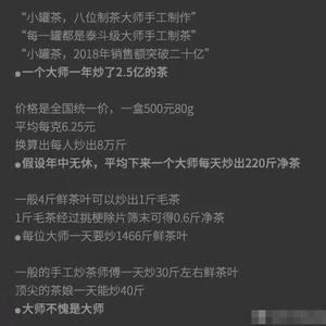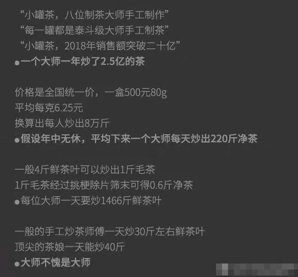 有人给小罐茶算了一笔账,“一个大师一年炒了2.5亿的茶”“假设全年无休,平均下来,一个大师每天炒出220斤净茶”、“顶尖的茶娘一天才炒40斤,小罐茶大师累不累?”