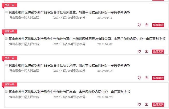 查阅相关案件的判决书,可以看到“黄山市徽州区供销农副产品专业合作社”多次出现,谢四十则是该机构的法定代表人。
