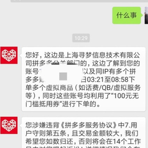 一名参与“薅羊毛”的网友表示,拼多多客服已与其取得联系,称其夜间下单多个虚拟商品,均使用了“100元无门槛抵用券”,这种行为涉嫌违背《拼多多服务协议》且金额较大,希望如数归还,否则将在14个工作日内提起诉讼。