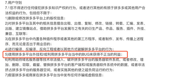 新浪科技查询了《拼多多服务协议》,在用户守则第五条写有:使用拼多多平台外挂或利用拼多多平台当中的BUG来获得不正当的利益,此举有损于拼多多和其他用户的合法权益。