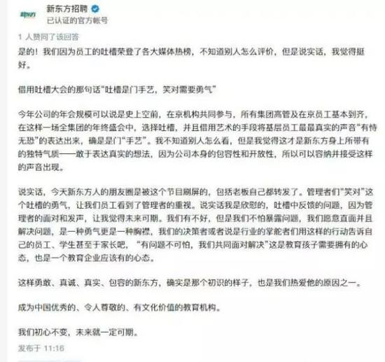 据悉,此次新东方的年会规模是史上空前,在京机构共同参与,所有集团高管及在京员工基本到齐。新东方方面同时表示,吐槽中反馈的问题,因为管理者的面对和发声,让我觉得未来可期。我们有不好,但是我们不怕暴露问题,我们愿意直面并且解决问题,是一种勇气更是一种胸襟,我们的决策者或者说是行业的掌舵者们用这样的行动告诉自己的员工、学生甚至于家长吧, “有问题不可怕,我们共同面对解决”这是教育孩子需要拥有的心态,也是一个教育企业应该有的心态。
