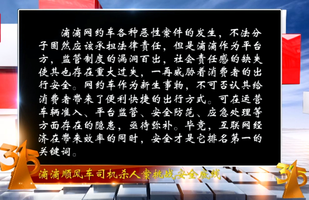 评点:滴滴网约车各种恶性案件的发生,不法分子固然应该承担法律责任,但是滴滴作为平台方,监管制度的漏洞百出,社会责任感的缺失,使其也存在重大过失,一再威胁着消费者的出行安全。网约车作为新生事物,不可否认其给消费者带来了便利快捷的出行方式。可在运营车辆准入、平台监管、安全防范、应急处理等方面存在的隐患,亟待弥补。毕竟,互联网经济在带来效率的同时,安全才是它排名第一的关键词。