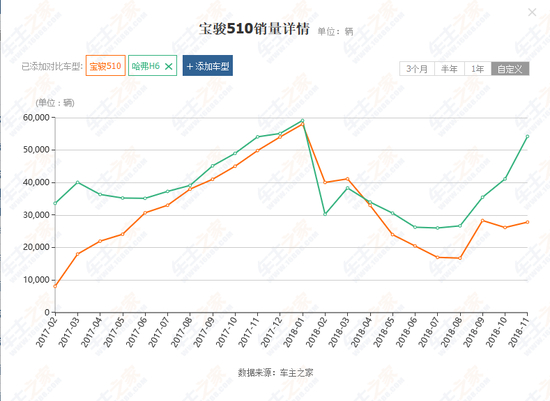 宝骏510自上市伊始实现连续11个月环比增长,一度迫近神车哈弗H6,但到了2018年2月突然出现滑坡,此后虽然能稳定在SUV销量第二,可与哈弗H6的差距开始逐渐拉大。