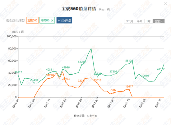 例如,宝骏560在2016年还是市场前三的销量水平,到了2017年却立马出现了销量大跳水。再到2018年,这款SUV干脆直接停产了,寿命仅三年。