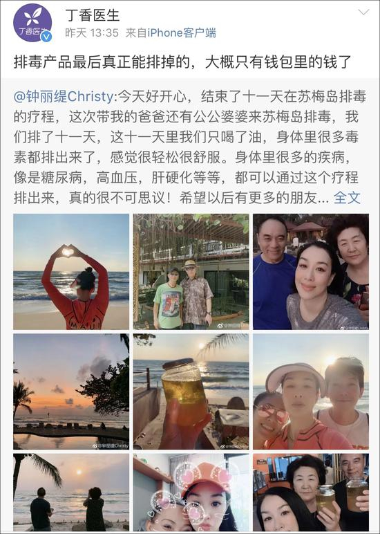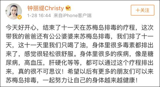 1月28日,钟丽缇在微博晒出泰国苏梅岛美景时写道,“带爸爸、公婆到苏梅岛进行11天排毒疗程,期间只喝油,身体里很多毒素都排出来了,感觉很轻松很舒服,糖尿病、高血压、肝硬化等疾病都可以透过此疗程排出来,希望更多人到苏梅岛排毒”。